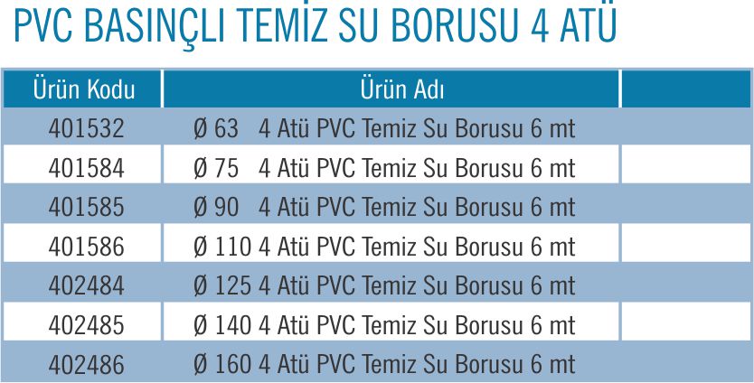 PVC BASINÇLI SU BORUSU 4 ATÜ