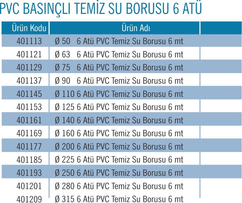 PVC BASINÇLI SU BORUSU 6 ATÜ